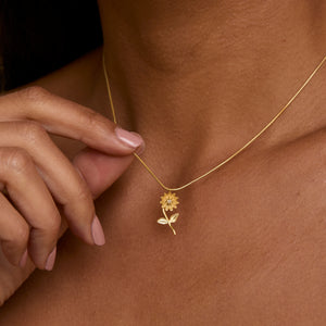 Our gold necklaces last a long time when you care for them right. The special coating keeps your jewelry shiny and new for years. Keep it in the jewelry box it comes with. Don't spray perfume on it. With gentle care, this birth flower charm will stay beautiful and become a family treasure.