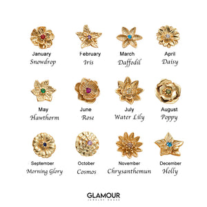 Simply pick your birth month from our collection of 12 beautiful flower designs. Each flower represents different qualities - roses for love, daisies for new beginnings, and water lilies for rebirth. Shop now and upgrade your look with meaningful jewelry.