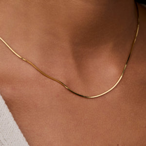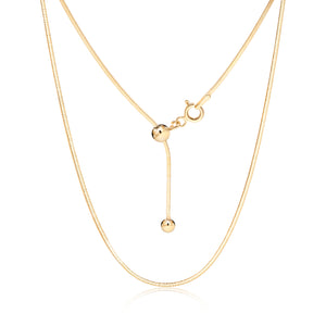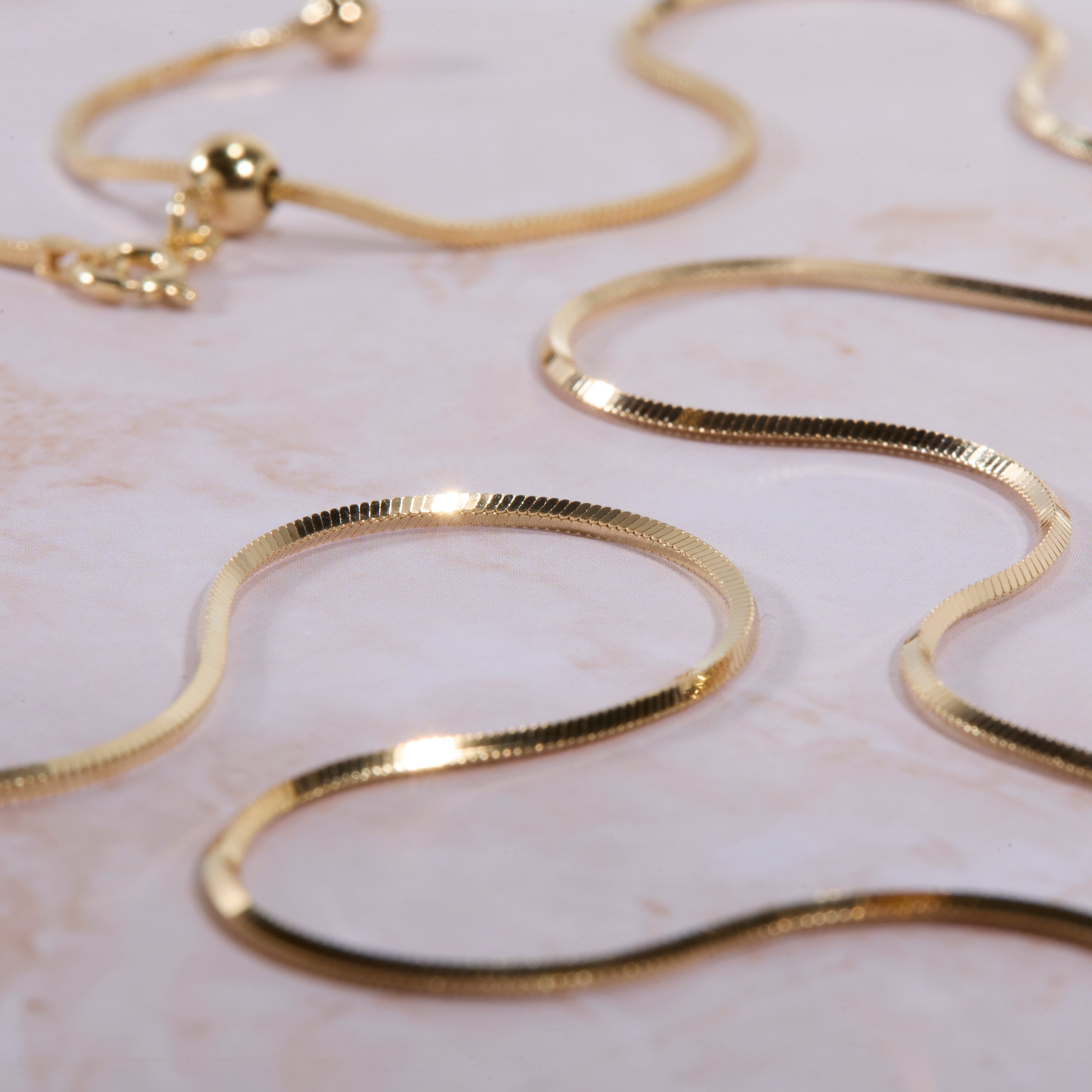 Add luxury to your look with our stunning box chain necklace made of 18K Gold Vermeil. This classic piece features smooth, square links that create an eye-catching shimmer perfect for any occasion. Our gold box chain comes in a versatile 23-inch length with an innovative sliding clasp that adjusts to any size, giving you complete freedom to customize the fit according to your outfit or preference.