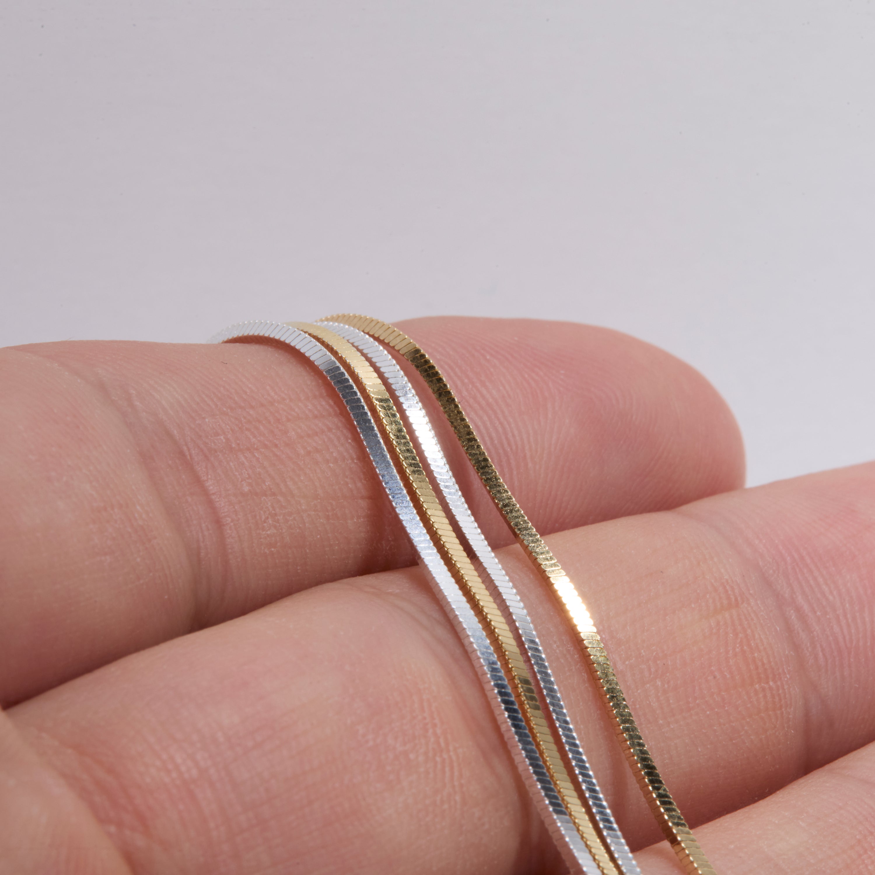 Box chains stand out with their unique square links that create a smooth, modern look. Unlike round link chains with a traditional style, box chains have a contemporary geometric shape that catches light differently, creating subtle sparkles as you move. Our box chain is stronger and more durable than lighter styles, making it less likely to kink or tangle. The sliding clasp adds exceptional versatility not found in standard fixed-length chains.