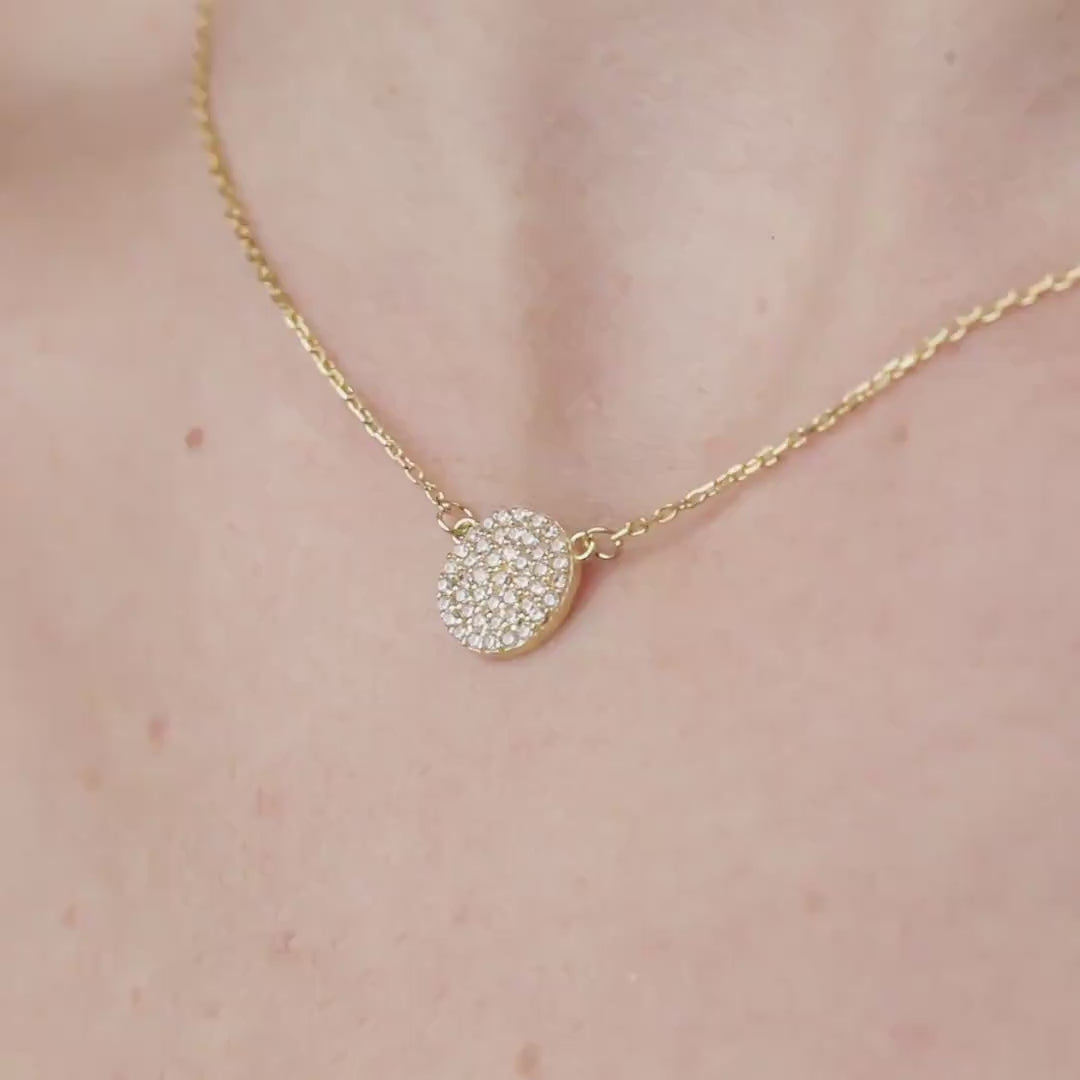 Add a touch of everyday elegance with our stunning round pendant necklace. Crafted in premium 18K Gold Vermeil, this circle pendant features meticulously set cubic zirconia stones in a beautiful pave arrangement that catches light from every angle. The delicate chain complements the pendant perfectly, creating a balanced piece that sits gracefully at your collarbone. This versatile dainty jewelry piece offers just the right amount of sparkle for both everyday wear and special occasions.