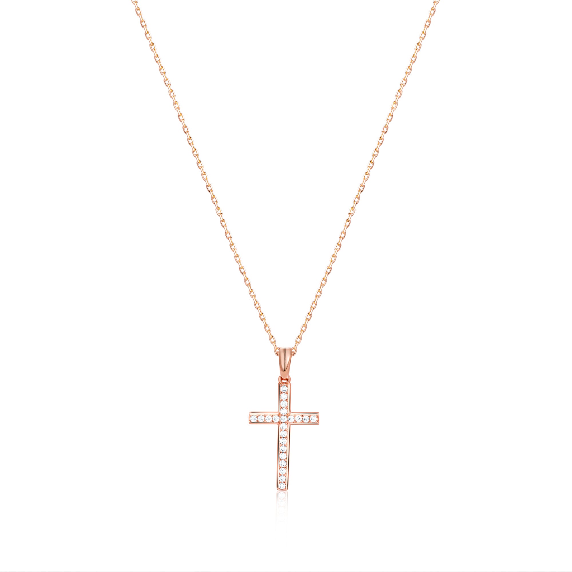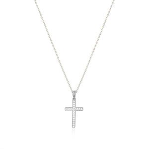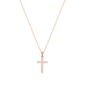 This elegant cross necklace features a beautifully crafted pendant adorned with sparkling cubic zirconia stones in a luxurious 18K gold vermeil setting. The delicate pave design catches light from every angle, creating a subtle yet eye-catching sparkle that adds a touch of glamour to this meaningful symbol. Perfect for everyday wear or special occasions, this cross necklace for women offers both spiritual significance and sophisticated style in one timeless piece.