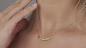 This exquisite personalized name necklace is crafted in luxurious 18K gold vermeil with a beautiful curvy script design. Completely customizable with your name, nickname, or meaningful word of choice, this stunning name plate necklace adds a personal touch to any outfit. The elegant script lettering creates a flowing, feminine look that catches the light beautifully as it rests against your skin.