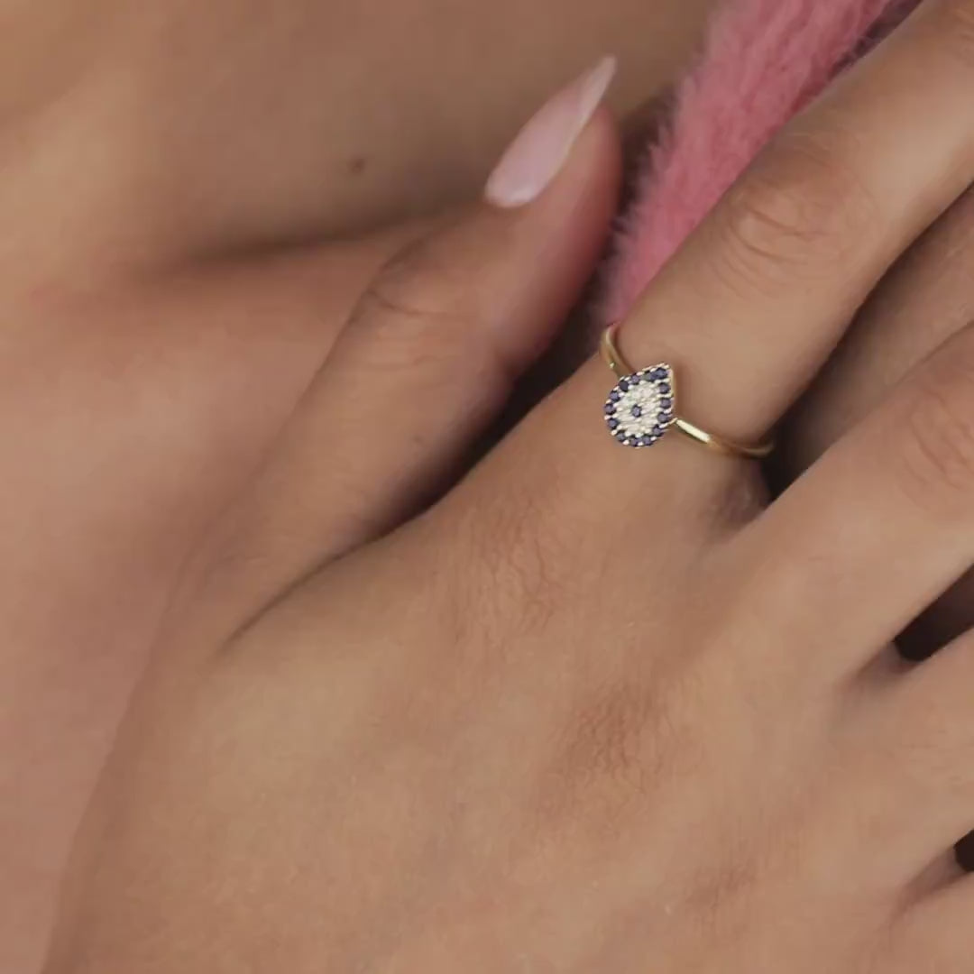 Our Evil Eye Ring shines as a versatile accessory for any wardrobe. Wear it solo for a subtle statement or stack with thin bands for a personalized look. This ring pairs beautifully with both casual outfits and formal attire. For maximum impact, coordinate with other evil eye pieces or complement with simple blue accessories to enhance the striking sapphire-colored stones.