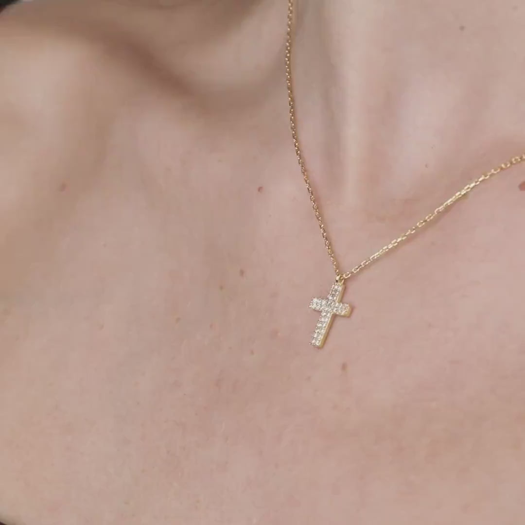 Embrace timeless symbolism with our exquisite gold cross necklace in premium 18K Gold Vermeil. This dainty jewelry piece features a beautifully crafted cross pendant adorned with sparkling pave-set CZ stones that catch the light with every movement, creating a subtle yet sophisticated statement that combines spiritual significance with elegant style for everyday wear.