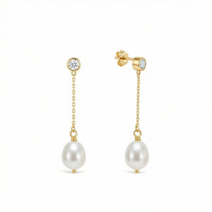 Upgrade your look with our stunning 18K gold vermeil pearl drop stud earrings. These beautiful freshwater pearl earrings feature a delicate chain that creates movement and catches the light with every turn. The perfect blend of classic elegance and modern design, these pearl drop earrings will make you feel confident and radiant for any occasion. Shop now before these bestselling earrings are gone!