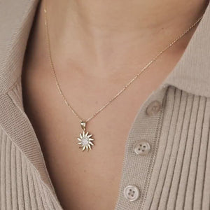Radiate positivity with our stunning sun pendant necklace featuring a brilliant diamond-studded center. This exquisite piece showcases a detailed sunburst design with textured rays that catch the light beautifully from every angle. Crafted from premium 18K Gold Vermeil, this celestial-inspired jewelry adds a touch of warmth and optimism to any outfit.
