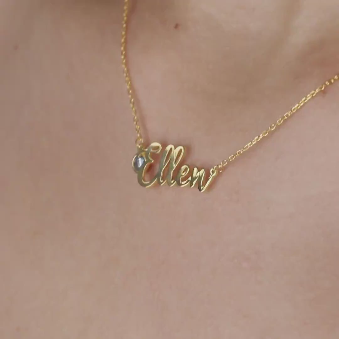 Express your identity with our elegant name plate necklace crafted in luxurious 18K Gold Vermeil. This stunning pendant features your name beautifully scripted alongside a genuine birthstone, creating a personalized piece that celebrates both your identity and birth month in one design.