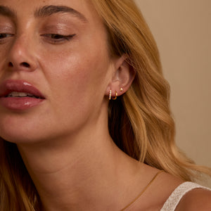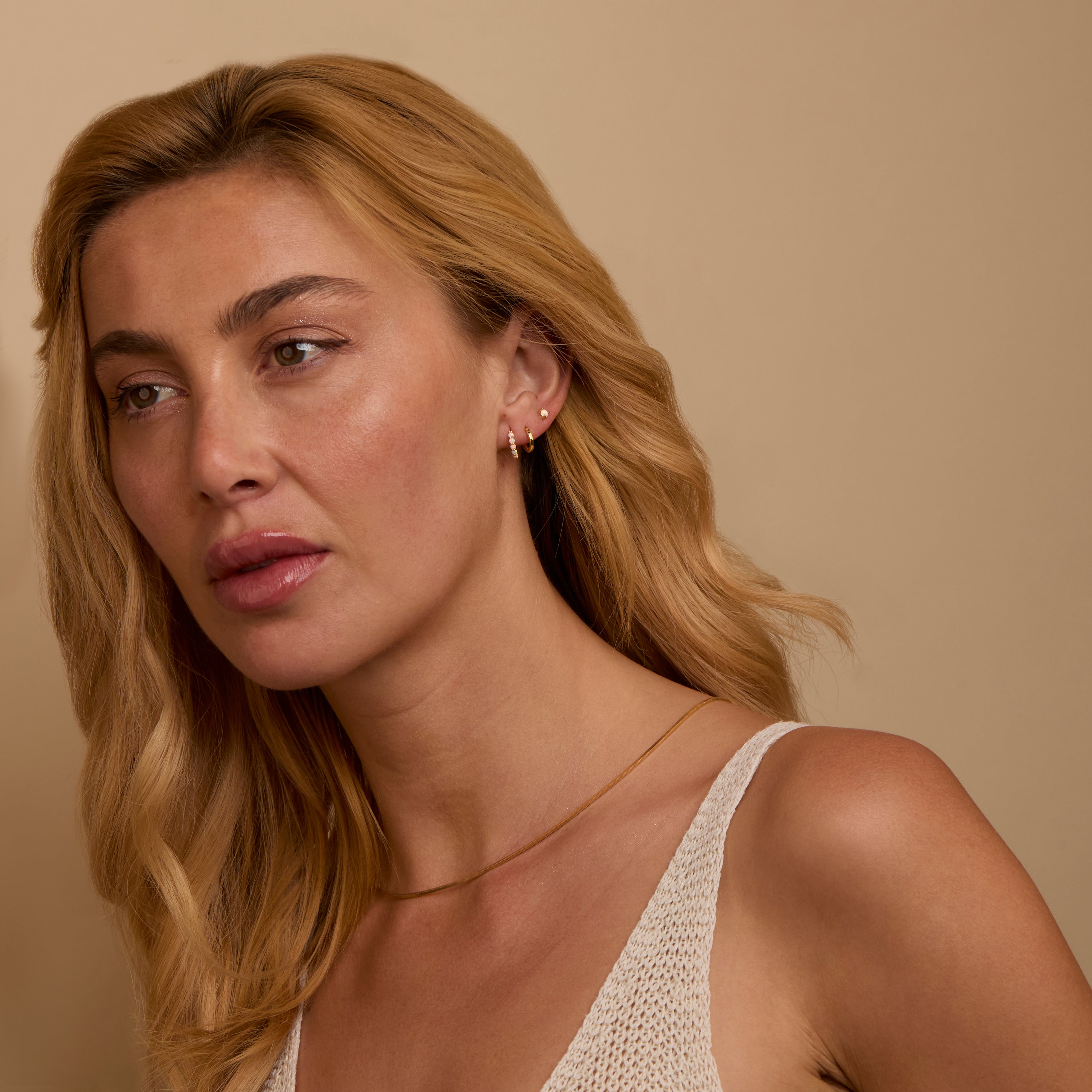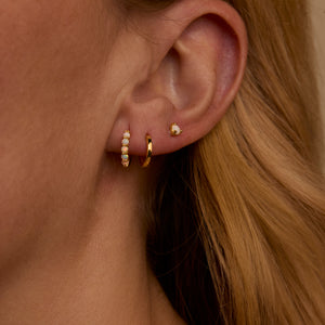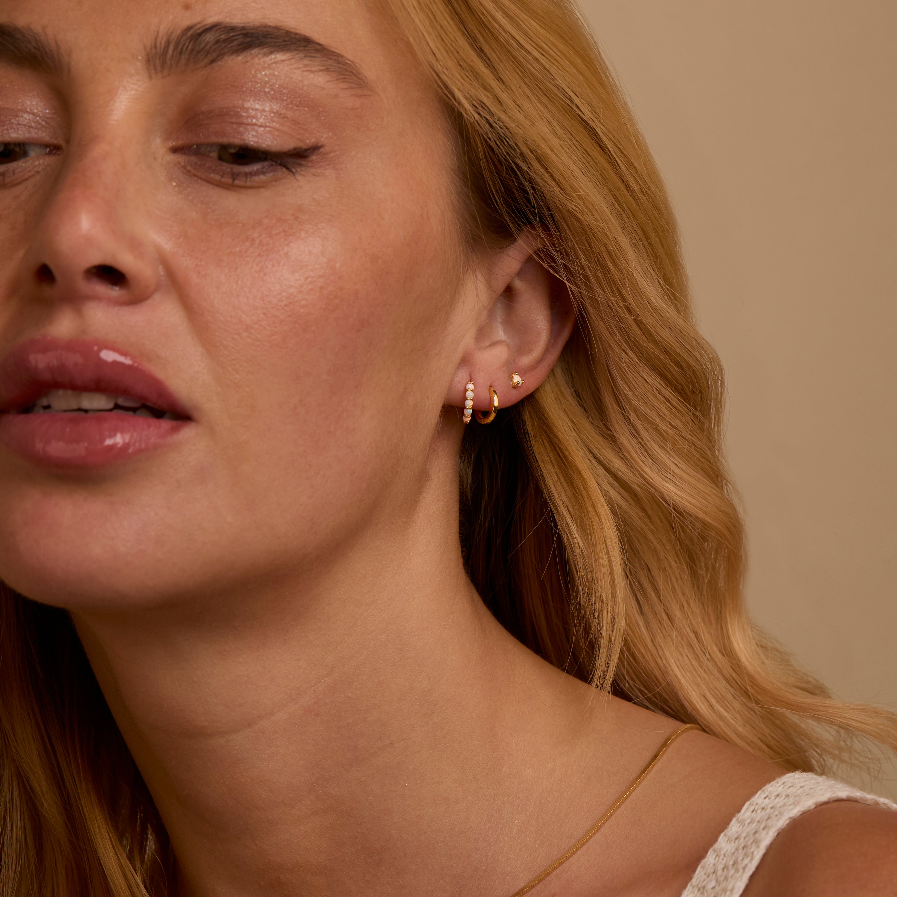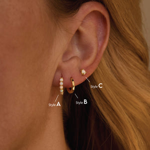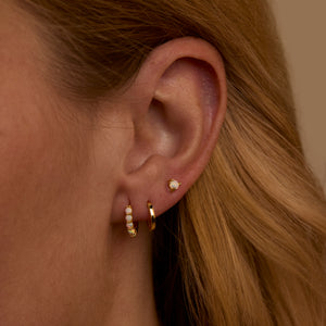 Creating your dream ear stack is easy with this versatile 3-piece set! Start with the opal studs in your first piercing, then add one huggie hoop in your second hole. Mix the smooth huggie with the textured opal huggie for visual interest. You can wear all pieces together or separately depending on your mood and outfit.