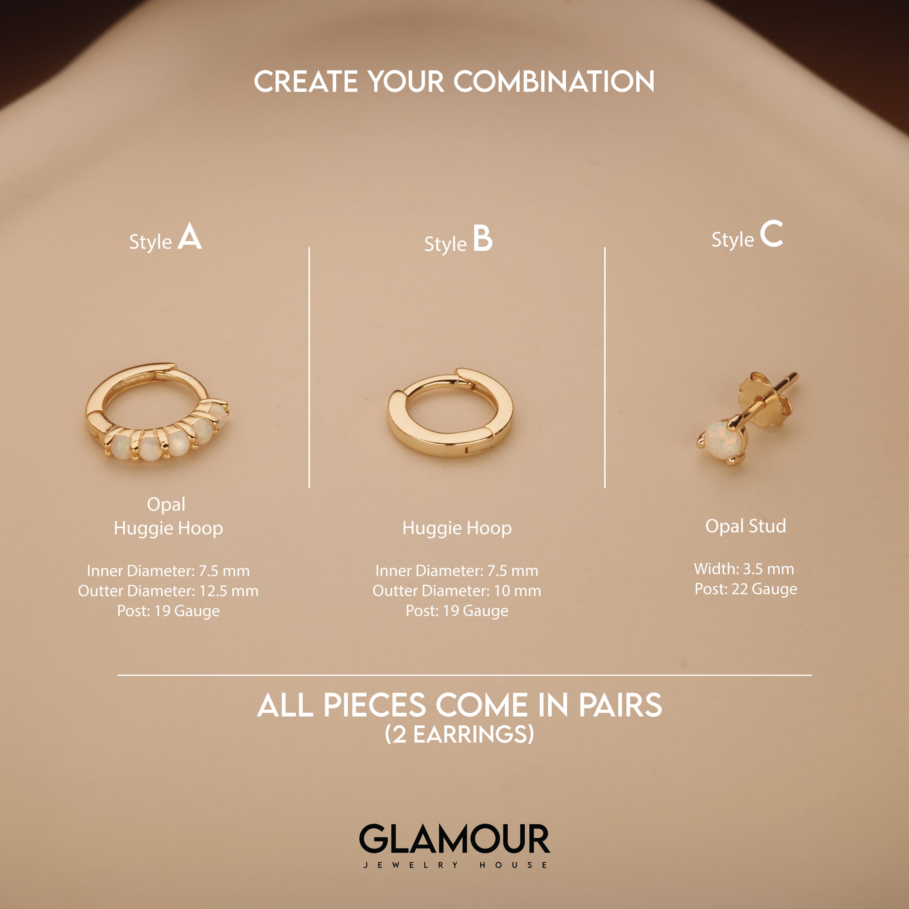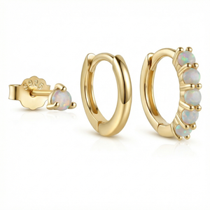 These versatile earrings work perfectly for everyday wear and special occasions. Mix and match the huggie hoops with studs to create your unique ear stack. Layer with other gold jewelry for a cohesive look, or wear alone for minimalist elegance. The opal stones catch light beautifully, adding sparkle to any outfit from casual to formal.