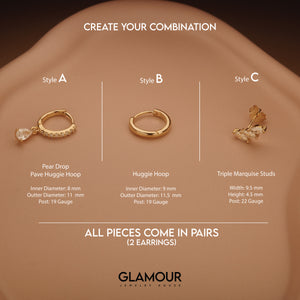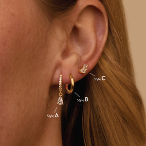 - Available as: Pairs - 6 earrings, Singles - 3 earrings, Style A Only - Pair, Style B Only - Pair, Style C Only - Pair