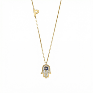Embrace tradition and personal style with our exquisite hamsa necklace in premium 18K Gold Vermeil. This meaningful jewelry features your custom name in elegant script paired with a beautifully detailed hamsa hand pendant adorned with a subtle blue stone centerpiece, creating a personalized protective talisman that combines cultural significance with your unique identity.