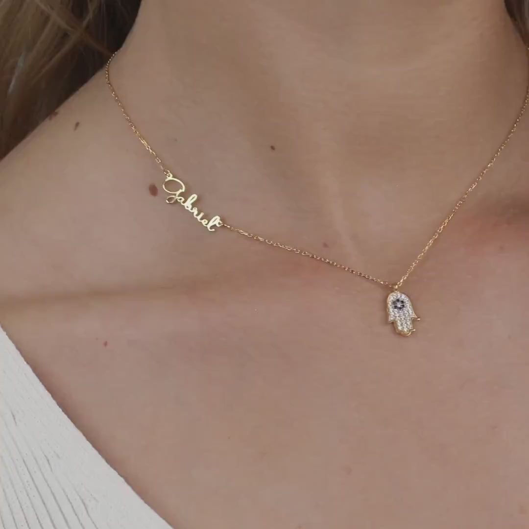 Create a jewelry collection that tells your story by pairing your name plate necklace with complementary pieces. For a balanced look, layer your hamsa pendant with a simple chain at a different length. The sideways positioning of your personalized name creates an asymmetrical design that adds modern flair to the traditional hamsa symbol, creating a unique and eye-catching arrangement.