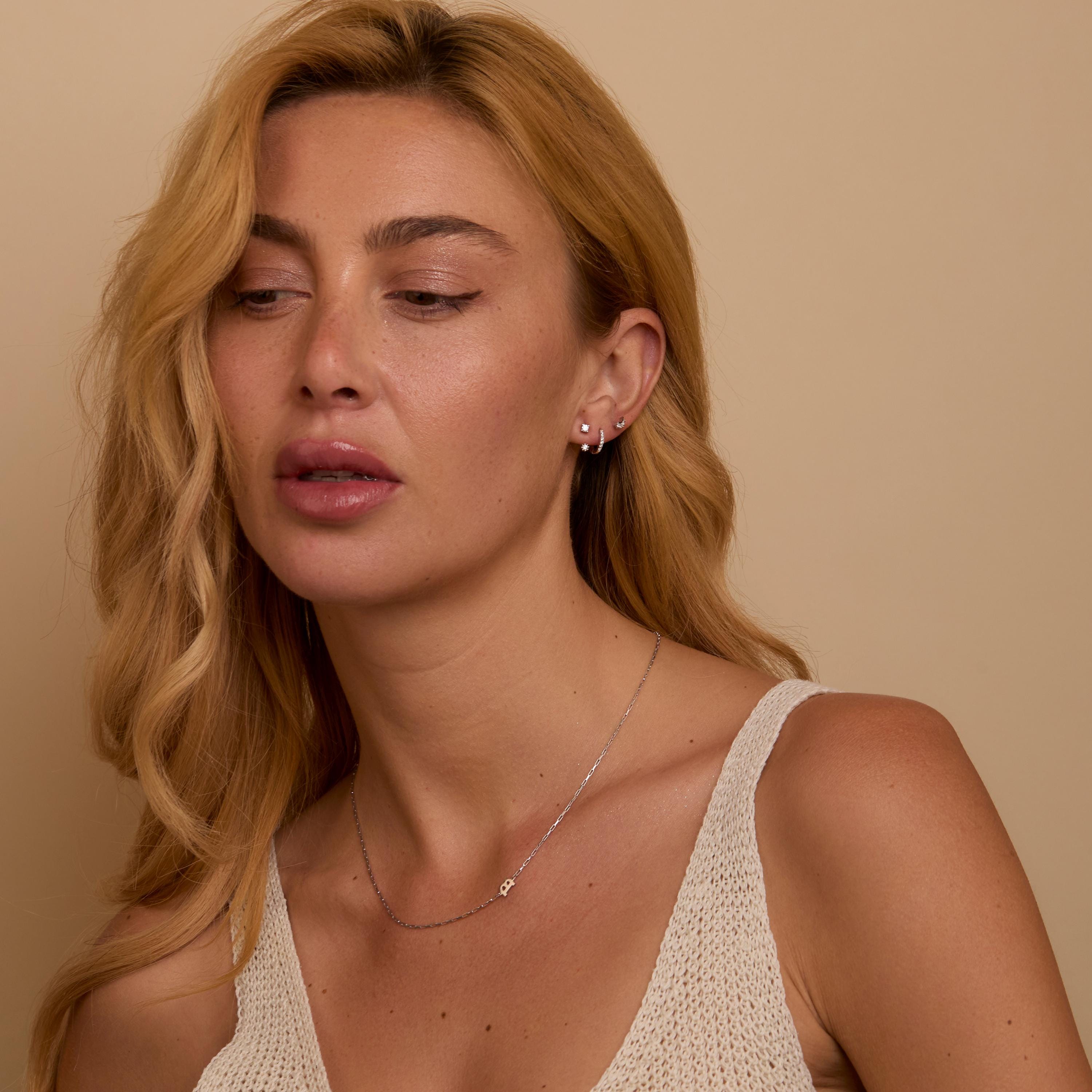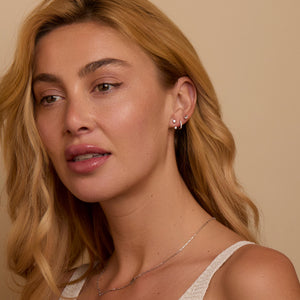 Mix the crystal studs in your first hole with huggie hoops in second piercings. Add the ear jacket for dramatic effect. These dainty earrings create perfect balance. Each style complements the others beautifully.
