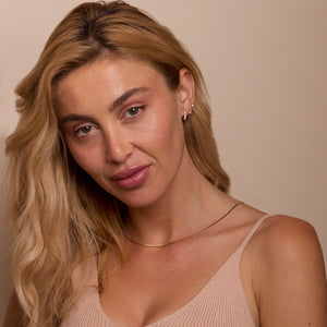 Making your ear stack is fun and easy. Put the classic huggie hoop in your first ear hole. Add the opal huggie hoop earrings in your second hole. Finish with the small opal stud in your third piercing. Now you have a beautiful layered earring look.