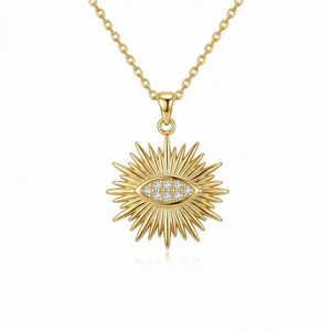 Our gold sun necklace beautifully merges two powerful symbols: the protective eye and the life-giving sun. The detailed sunburst design represents energy, clarity, and new beginnings, while the central eye motif offers protection and awareness. The delicate yet striking pendant hangs from a fine chain that complements without overwhelming, creating a balanced piece that draws attention for all the right reasons.