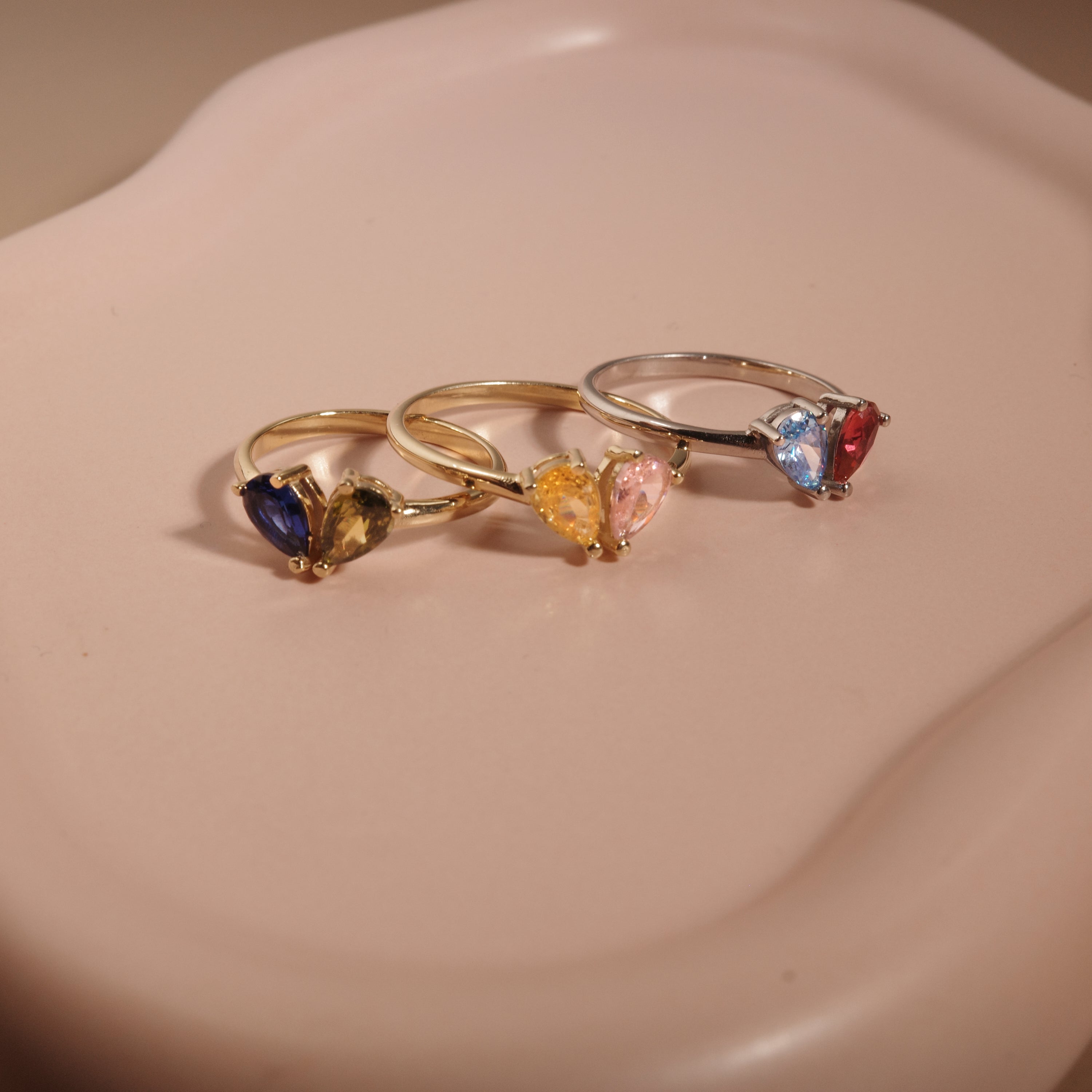 - Two pear-shaped birthstone settings in premium metal